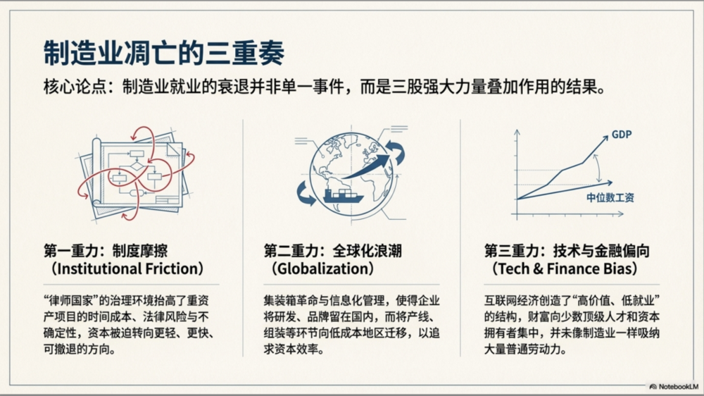 美国制造业就业的长期下降,很难用单一原因解释。更像三股力量在同一时期叠加:制度摩擦上升(行动被程序包围),全球化把制造自然推向低成本地区,以及互联网与金融化的繁荣把收益集中到少数高技能人群,让“制造业中产”失去被替代的承载产业。