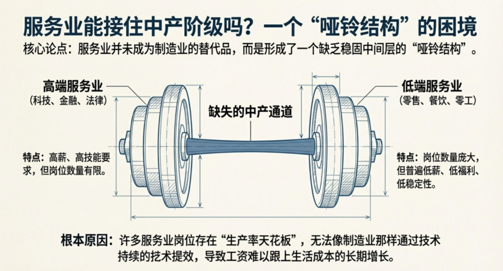 服务业的高端部分(科技、金融、法律、部分医疗与专业服务)确实能创造巨大价值,但它对教育、技能和城市集聚的要求极高,岗位数量有限,无法吸收被制造业挤出的庞大劳动力。