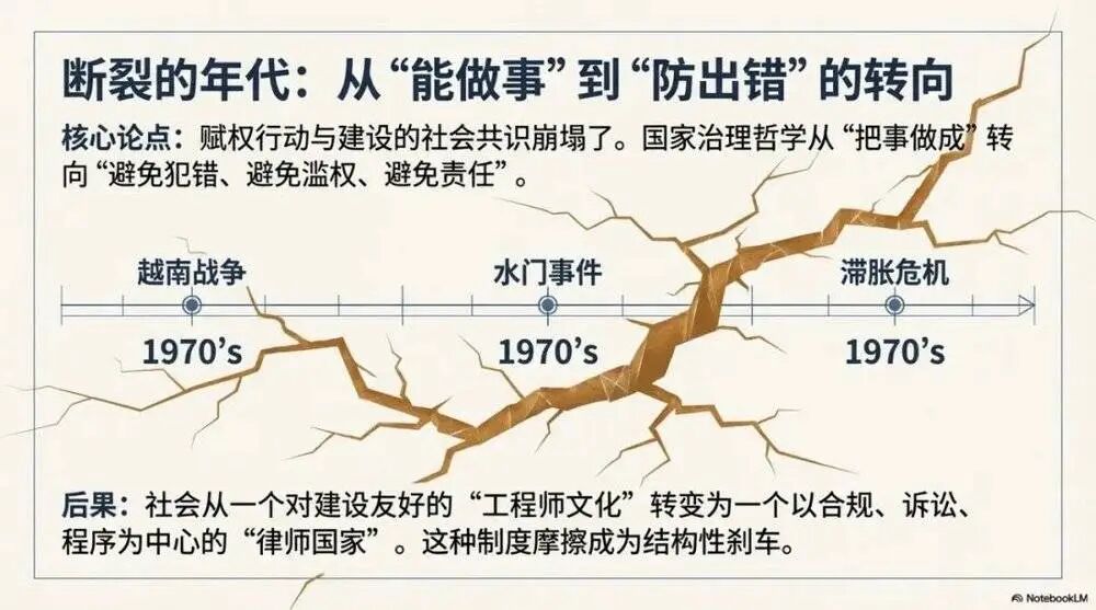 越战和水门事件不仅改变了政治版图,更改变了“国家能不能被授权去做事”的社会共识。越战让人们看到决策的傲慢与信息不透明,水门让人们看到权力的滥用与撒谎。结果是:美国政治与公共治理逐渐进入一种防御姿态——宁可慢、宁可不做,也要避免犯错。对公共工程和产业建设而言,这是一种结构性的刹车。