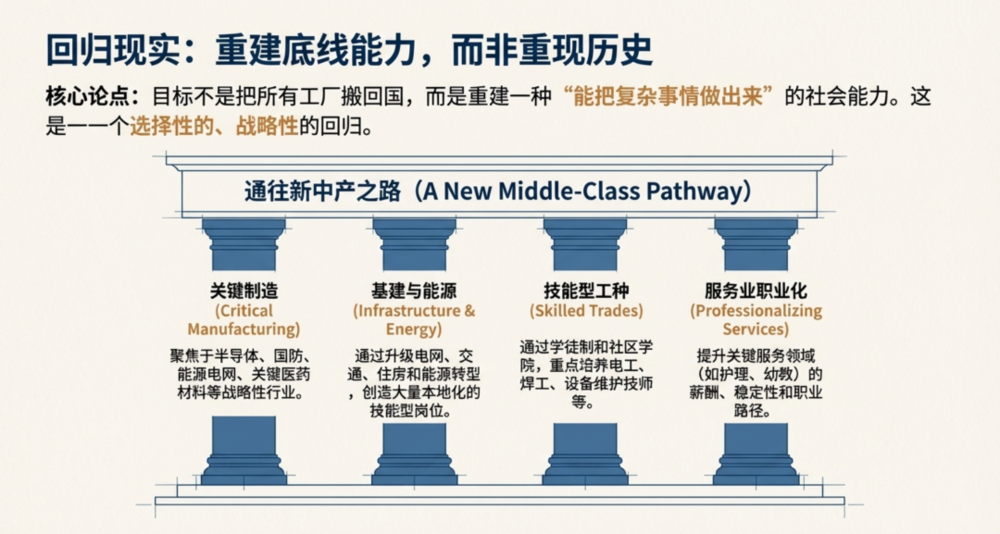 如果把这些政策组合在一起,美国也许无法再拥有 1950 年代那种制造业占比,但可以形成一种新的稳定结构:关键制造+基础设施更新+技能型工种(电工、焊工、设备维护、建筑与能源改造)共同提供一条可规模化的体面就业道路。