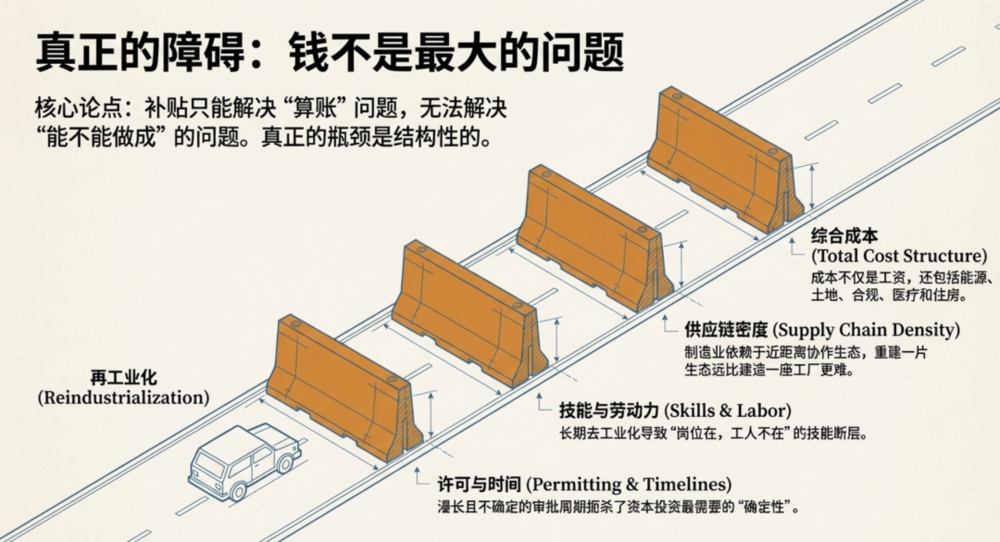 如果把“制造业回归”理解为一场单纯的补贴竞赛,就会低估美国面临的结构性阻力。补贴当然重要,但它更多解决“算账能不能过”的问题,而不是解决“能不能做成”的问题。对制造业而言,真正的瓶颈往往出现在四个地方:许可与时间、技能与劳动力、供应链密度以及成本结构。