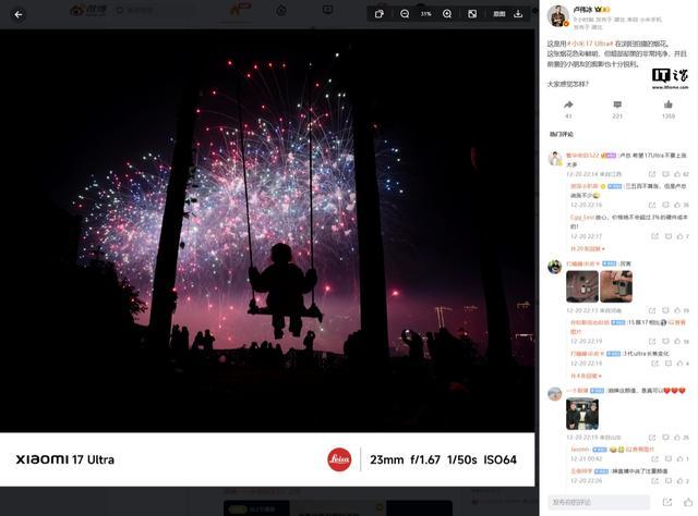 据IT之家今日早些时候报道,小米集团合伙人、总裁,手机部总裁,小米品牌总经理卢伟冰昨晚公布了小米 17 Ultra 手机的首张样片,称照片中“烟花色彩鲜明,但暗部却黑的非常纯净,并且前景的小朋友的剪影也十分锐利。”
