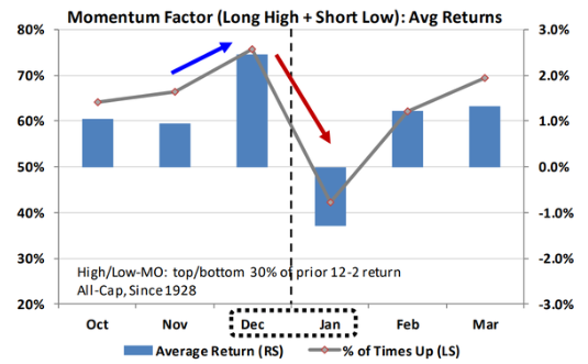 此外,而1月份动量因子(SPMO)一直是全年表现最差的月份,该因子追踪过去12个月市场领头羊与落后者的表现。12月份的优异表现通常反映了税收抵扣策略,即投资者卖出亏损股票以抵消资本利得税,这使得1月份成为动量策略表现最差的月份,因为“前一年表现不佳的股票随后会被买回”,这就是所谓的“一月效应”。