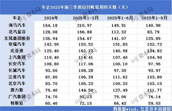 相较于2025年第一季度,所有车企前三季度应付账款周转天数均有所下降。