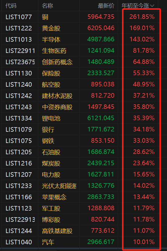 12月31日,港股2025年行情收官,港股市场热点板块涨幅显示,铜板块涨幅最为亮眼,其次是黄金股,半导体板块涨幅紧随其后,生物医药股、保险股、航空股、中资券商股、银行股、石油股、光伏股、军工股、汽车股皆表现强势。