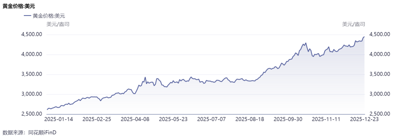 对于黄金市场而言,2025年无疑是非凡的一年,现货黄金价格年内50次刷新纪录。12月24日,现货黄金首次突破4500美元/盎司关口,再次刷新历史记录。12月26日,伦敦金现继续上扬,收于4532.41美元/盎司,今年以来已涨超72%。