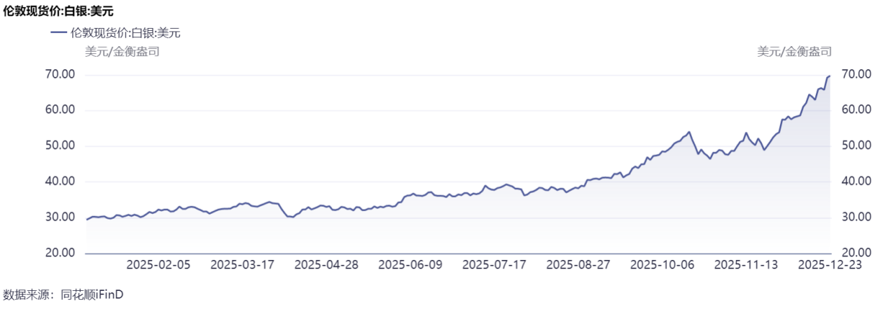 2025年,白银堪称贵金属市场的最大“黑马”。今年以来,现货白银从年初的29美元/盎司一路狂飙,屡创新高。进入12月,现货白银更是上演史诗级行情,伦敦银现涨势强劲,接连突破60美元和70美元关口。12月26日,现货白银日内大涨10%,收于79.33美元/盎司。截至12月26日,白银已涨近175%,涨幅超过黄金的两倍。