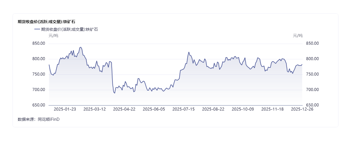 另外,铁矿石方面,铁元素供应增速远超需求增速,过剩基本面决定价格中枢下移。2025年,铁矿石期货市场呈现先抑后扬、再转深度下跌的曲折走势,宏观政策预期与基本面现实之间的博弈贯穿全年。年初虽有政策预期支撑,但随着海外贸易环境变化及国内产业调控预期增强,市场情绪转弱。终端钢材需求表现乏力,铁矿石等原料价格跌幅显著。