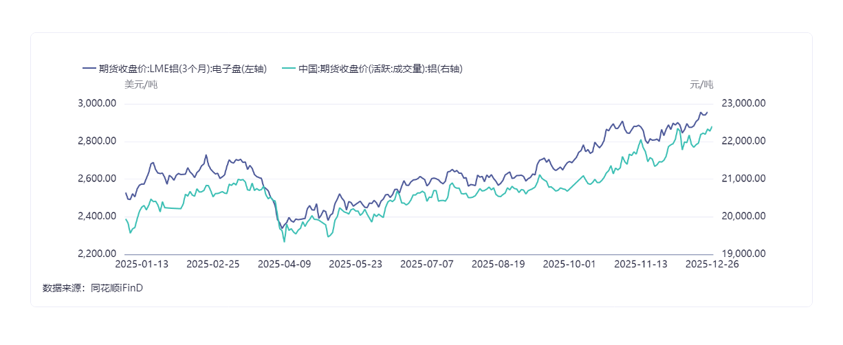 2025年4月以来,在全球宏观经济情绪回暖、海外供应扰动频发、国内需求稳健、库存维持低位等因素推动下,铝价开始新一轮强势上涨,运行重心稳步抬升,尤其是2025年9月美联储开启第二次降息以来,全球流动性预期进一步改善,贵金属及工业金属普遍迎来一波价格上涨,铝价亦强势走高,至2025年10月末,LME铝价已突破2888美元/吨,为自2022年6月以来的新高。截至12月24日,LME铝价收于2956.5美元/吨。12月26日,沪铝为22335元/吨。