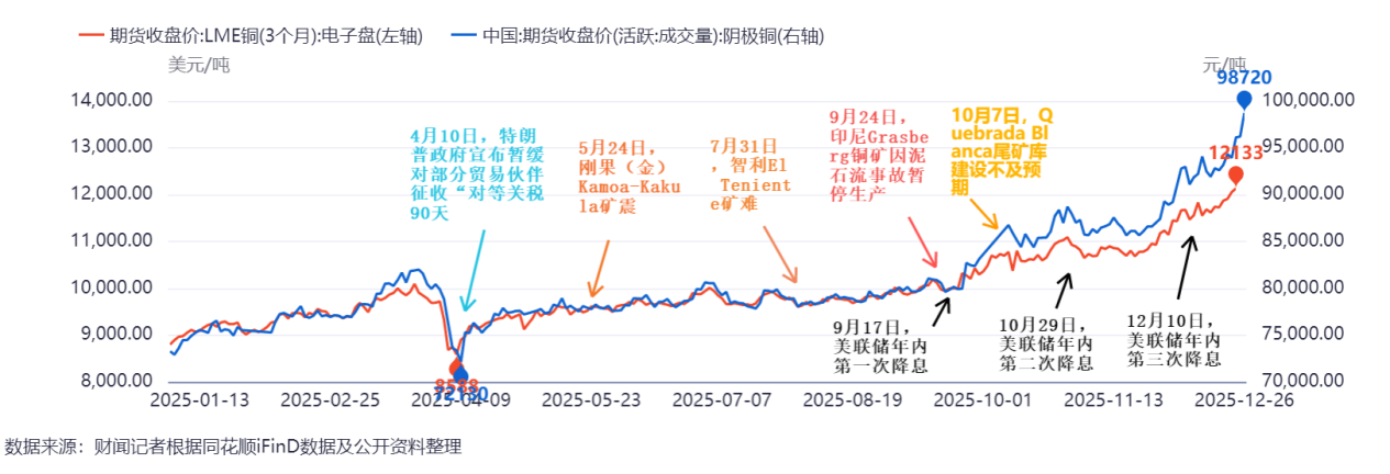 在2025年商品市场的竞赛中,铜无疑是最耀眼的明星。今年以来,美联储降息预期持续、全球主要铜矿产能受限、下游需求强劲等因素影响,铜价迎来史诗级上涨,屡创新高。截至12月26日,LME三个月期铜升至每吨12133美元/吨的纪录新高。国内铜价与国际铜价走势基本保持一致,12月26日夜盘,上期所交易的沪铜史上首次突破10万元人民币关口,收盘涨逾3.3%。今年以来,伦敦铜价累计上涨近40%,沪铜已涨超40%,铜被业内成为“新黄金”。