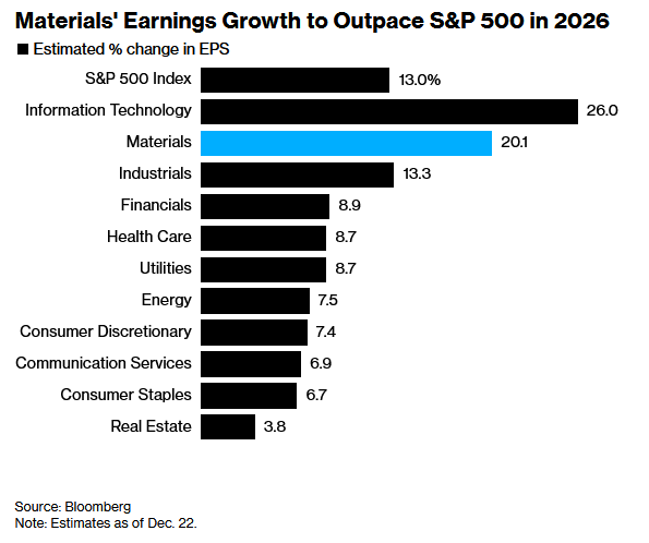 智通财经APP获悉,尽管特朗普政府的关税政策和消费者信心摇摆不定持续给美国企业带来阻力,但美国材料类股票在2026年的盈利增速有望攀升至五年来的最高水平。行业研究数据显示,材料板块2026年盈利预计将增长20%——该板块涵盖钢铁制造商纽柯钢铁(NUE.US)、涂料制造商宣伟公司(SHW.US)到包装制造商Smurfit WestRock(SW.US)、鲍尔包装(BALL.US)在内的一系列公司,该板块的盈利增速预计将仅次于科技板块。