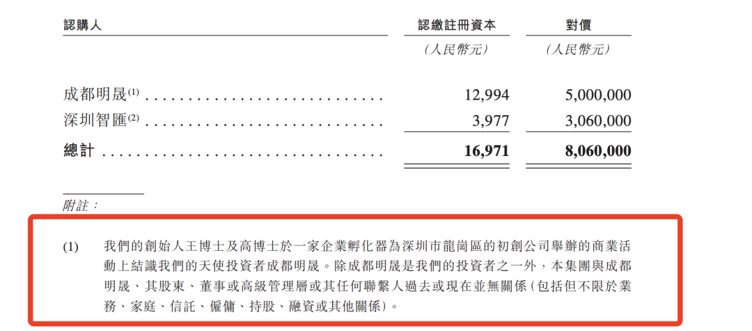 招股书显示,根据2017年11月2日订立的首轮注资补充增资协议,成都明晟同意收购赵凯持有的所有权益,总对价为人民币500万元(首轮天使融资)。