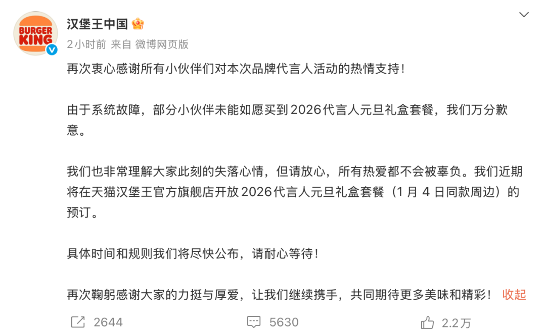 1月4日上午10时,汉堡王因代言人田栩宁的元旦礼盒上线,大量粉丝涌入导致其小程序和APP短时间崩溃,11时12分,汉堡王中国发文致歉,称正紧急修复系统。约一小时后,汉堡王中国再次致歉,称因系统故障部分用户未买到2026代言人元旦礼盒套餐,将近期在天猫官方旗舰店开放同款套餐预订,具体时间和规则会尽快公布。