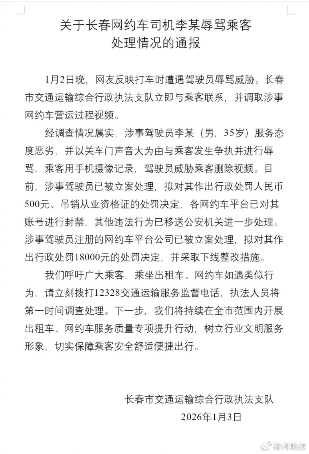 1月4日,吉林长春通报网约车司机辱骂乘客 :拟罚款500元,吊销从业资格 ,已移送公安机关进一步处理,网约车平台下线整改。