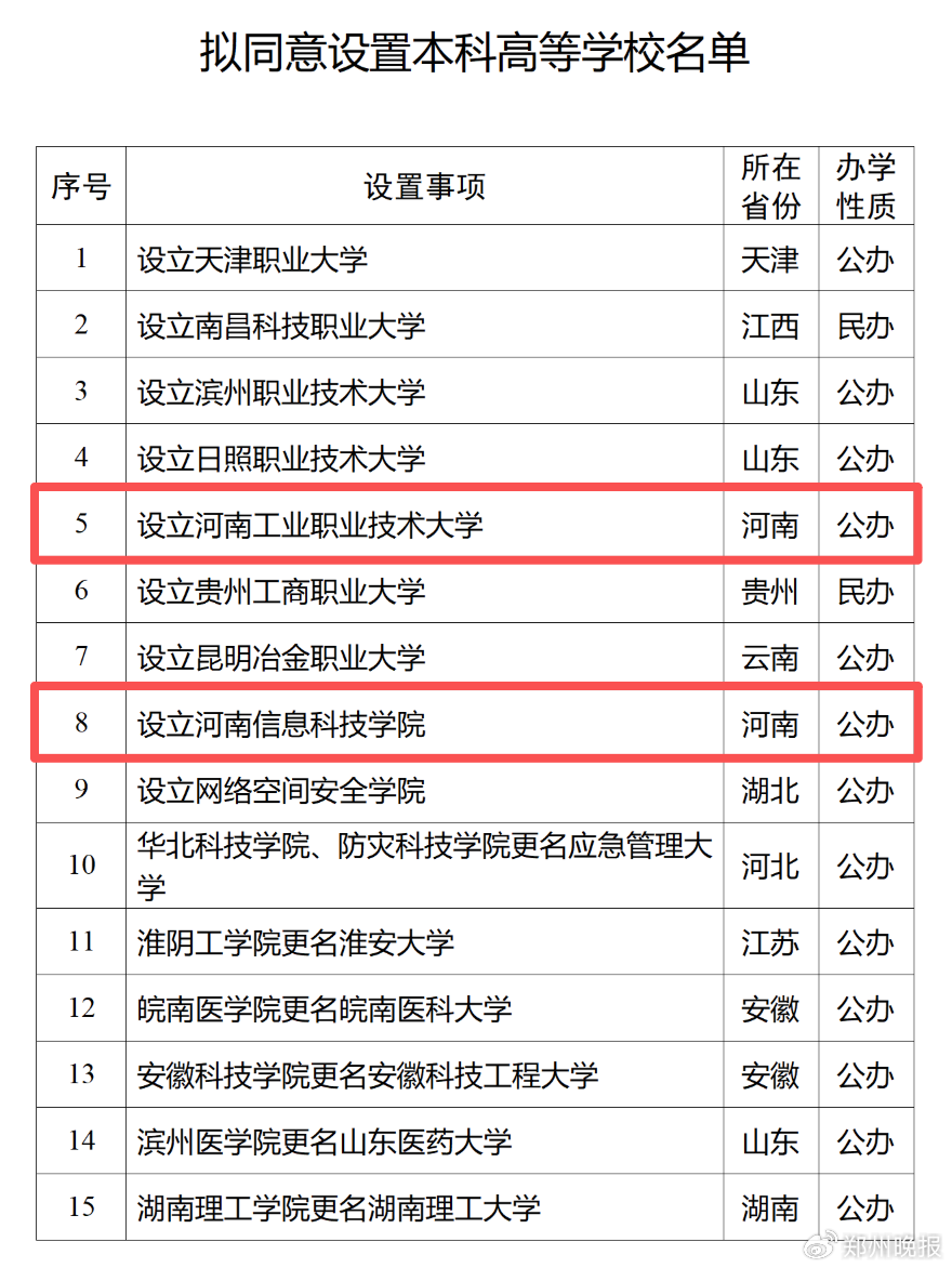 河南新增2所本科高校!教育部拟同意设置15所本科学校