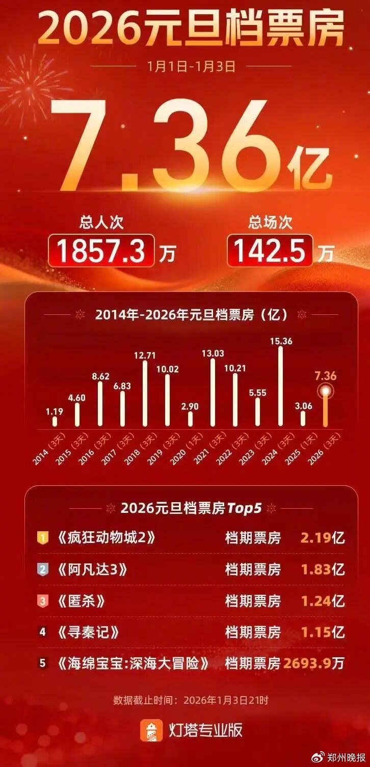 据灯塔专业版数据,截至1月3日21时,2026年元旦档(1月1日-1月3日)票房7.36亿元,《疯狂动物城2》获得2026元旦档票房冠军,并即将超越《复仇者联盟4:终局之战》登顶中国影史进口片冠军榜。