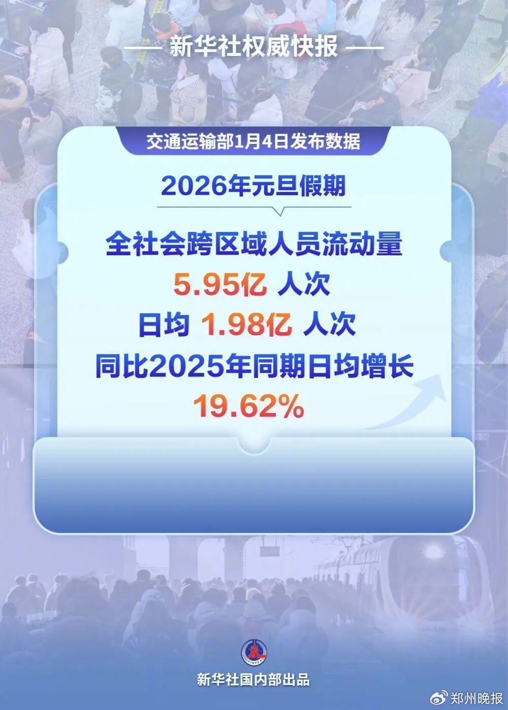 交通运输部1月4日发布数据显示,2026年元旦假期(1月1日至3日),全社会跨区域人员流动量为5.95亿人次,日均1.98亿人次,同比2025年同期日均增长19.62%。