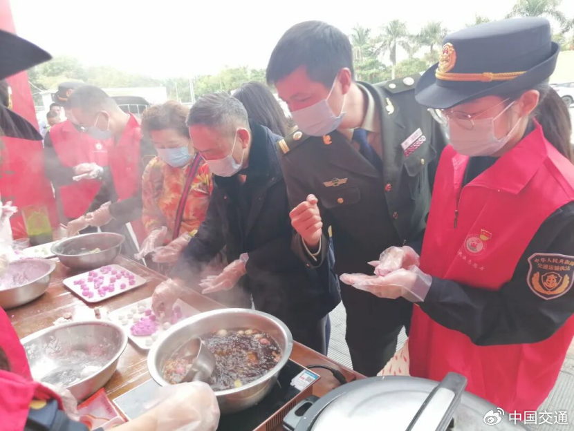 跨年夜,在沈海高速龙掘东服务区内,厦门高速执法支队等单位人员与司乘们一起搓汤圆,感受节日的温暖。