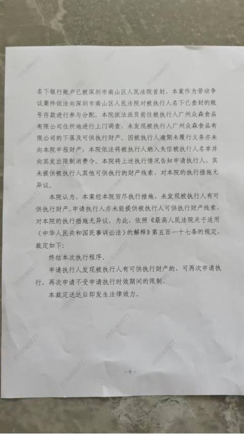 近日,一则来自法院的“终本”通知,让茶里讨薪员工的希望再次落空。执行裁定书显示,经法院调查,茶里旗下的广州众森食品有限公司(以下简称“众森食品”)无可供执行的财产,因此终结执行程序。这意味着,员工们通过法律途径追讨欠薪的努力暂时陷入了僵局。