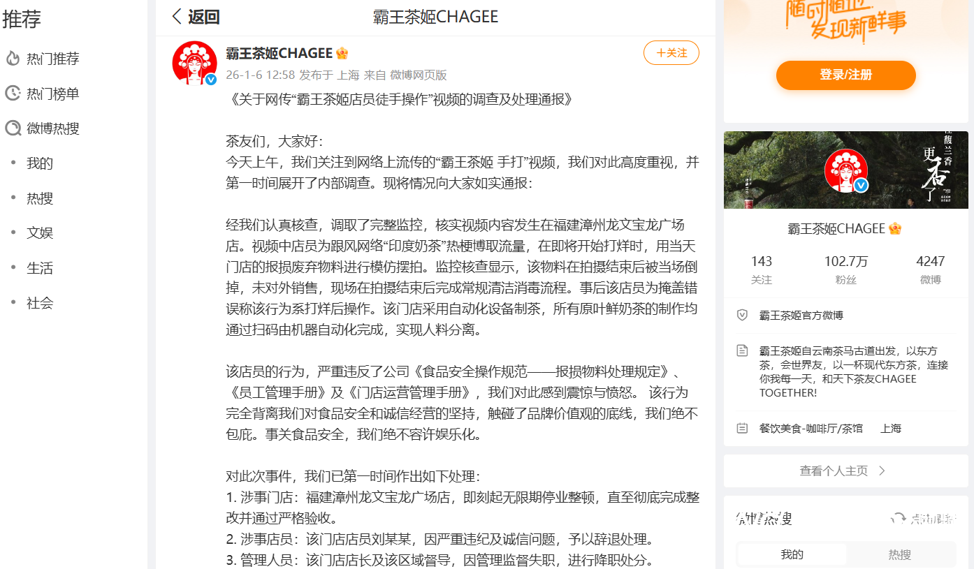 店员徒手制作饮品引争议!霸王茶姬:涉事门店无限期停业整顿