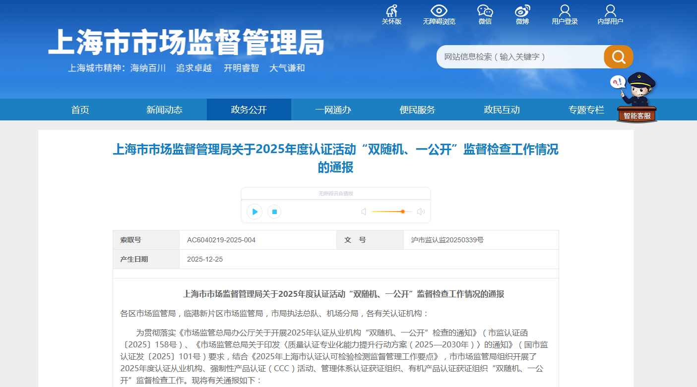 上海市市场监督管理局关于2025年度认证活动“双随机、一公开”监督检查工作情况的通报