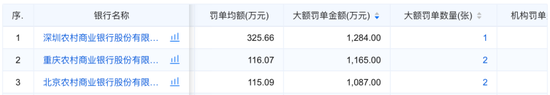 在563家农商行中,深圳农村商业银行、重庆农村商业银行和北京农村商业银行的大额罚单金额排名前三,被罚金额分别为1284万元、1165万元和1087万元。
