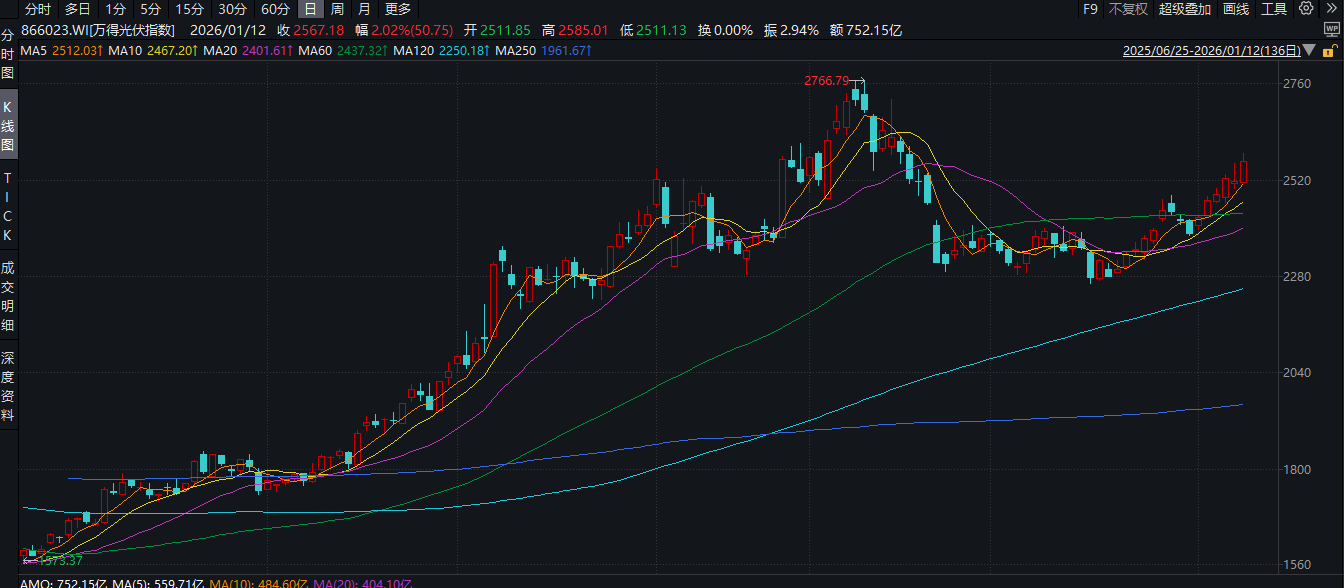 市场对政策调整已作出积极反应。自2026年以来,万得光伏指数已录得6连阳;1月12日,港股光伏板块亦迎来普涨行情,截至当日收盘,协鑫新能源(00451)涨24.64%,北京能源国际(00686)涨6.19%,彩虹新能源(00438)涨4.8%,协鑫科技(03800)涨3.81%,福莱特玻璃(06865)涨3.31%,信义玻璃(00868)涨2.12%,新特能源(01799)涨1.76%。