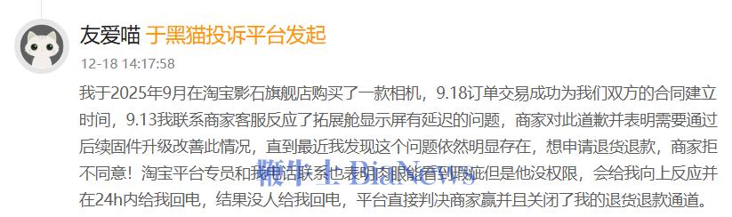 除了图片导出问题,也有不少用户在消费者投诉 【下载黑猫投诉客户端】平台提及这类相机的产品质量问题。在黑猫投诉平台,有消费者发起投诉称:于2025年9月在淘宝影石旗舰店购买了一款相机,9.13我联系商家客服反应了拓展舱显示屏有延迟的问题,商家对此道歉并表明需要通过后续固件升级改善此情况,直到最近我发现这个问题依然明显存在。