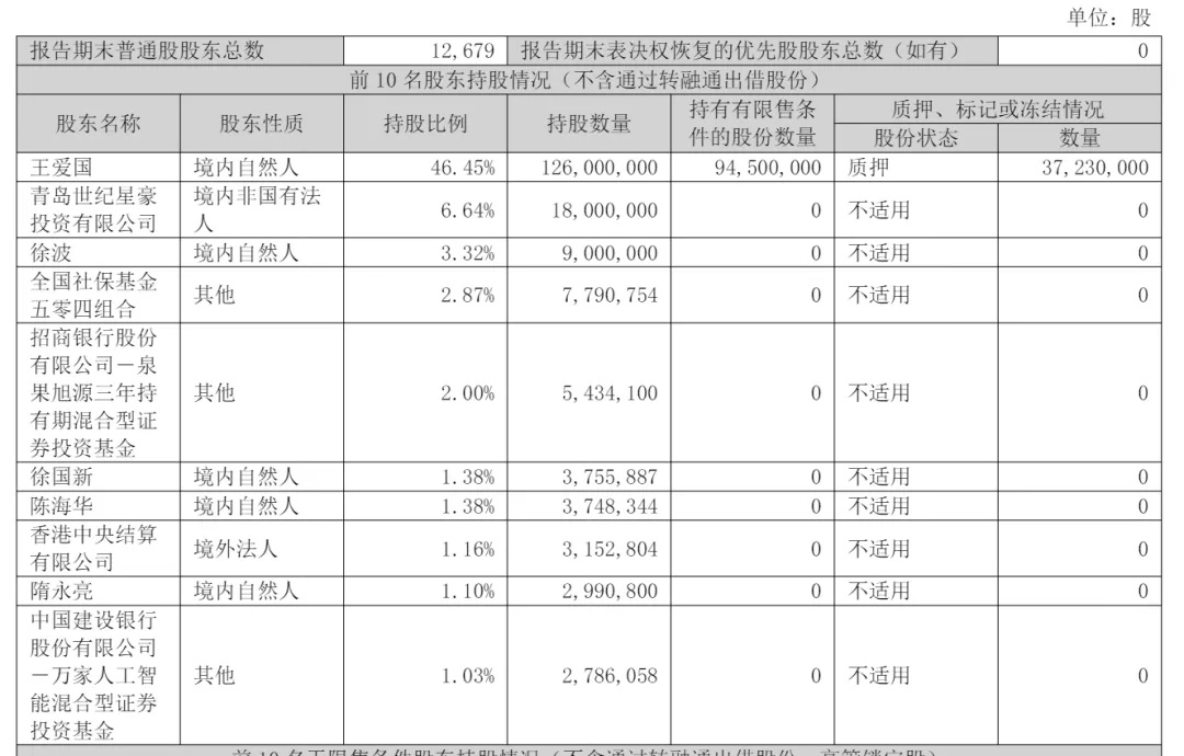 截至2025年9月30日,王爱国持股为46.45%,青岛世纪星豪投资有限公司持股为6.64%,徐波持股为3.32%;