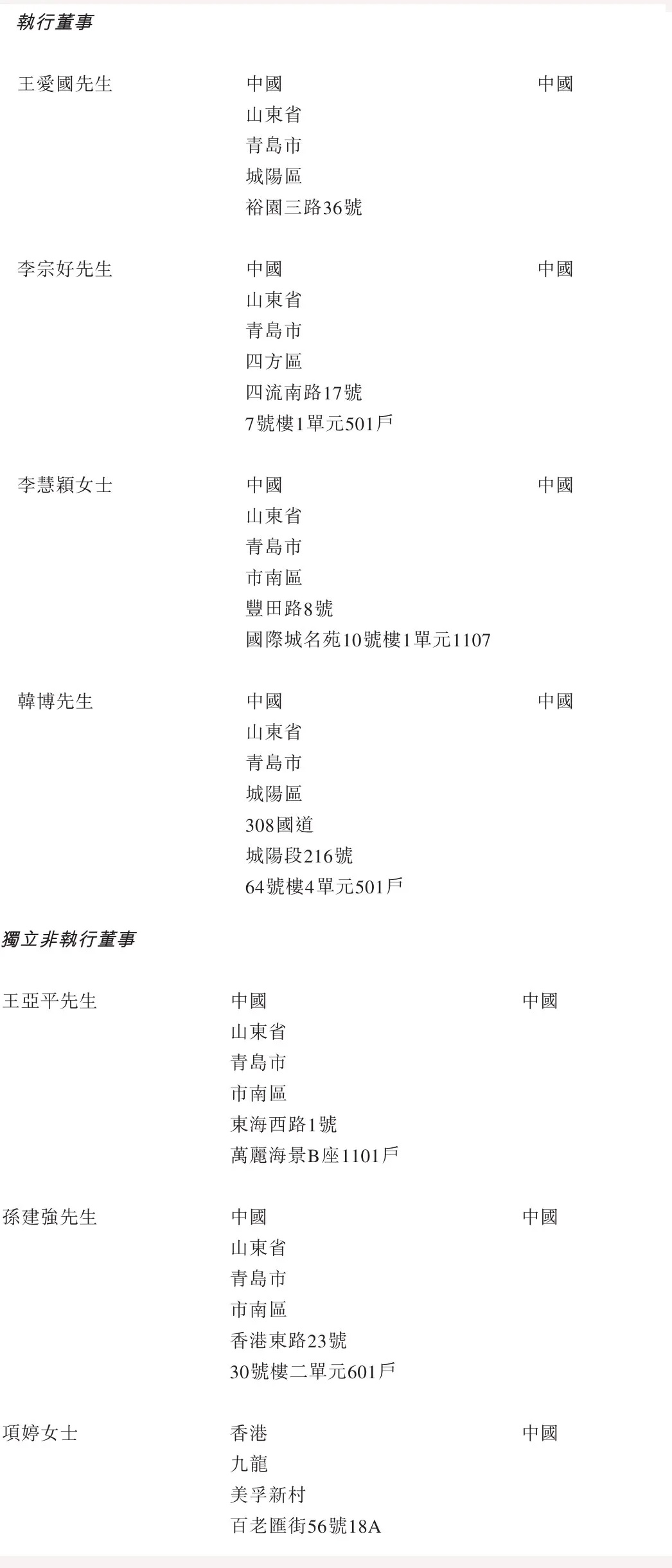 王爱国,56岁,于2000年创立集团,并于化工行业累积逾24年的经验。王爱国于2000年12月至2011年7月担任公司执行董事、总经理兼技术中心主任;于2011年7月起一直担任公司董事长、总经理兼技术中心主任。