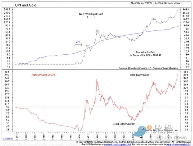 在法币系统中,黄金的传统观点是抗通胀工具。因此,它应该大致跟踪帝国操纵的CPI指数。上图显示,自20世纪30年代以来,黄金大致跟踪了该指数。然而,自2008年起并在2022年后加速,金价的上涨速度远超通胀。那么,黄金是否存在泡沫,准备收割我这样的赌徒?