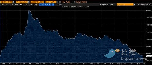 如果黄金处于泡沫中,散户应该会蜂拥而至。交易黄金最流行的方式是通过ETF,其中GLD是最大的。当散户疯狂买入黄金时,GLD的流通份额会增加。为了跨越不同时期和金价体系进行比较,我们必须将GLD的流通份额除以实物金价。下图显示,这一比率正在下降而非上升,这意味着真正的黄金投机狂热尚未到来。