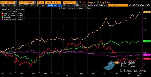 首先,让我们对比一下比特币、黄金和纳斯达克在特朗普第二个任期首年的回报率。这些资产的表现与美元流动性的变化相比如何?
