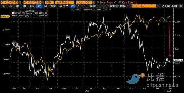 在美国,这种分析是个新鲜事,但工业政策其实和中国一样根深蒂固,只是营销方式不同。特朗普喝下了AI的“迷魂药”,“赢得AI竞争”成了他的经济纲领。美国政府事实上已经将任何被认为有助于“取胜”的组成部分国有化。通过行政命令和政府投资,特朗普正在钝化市场信号,让资本不计回报地涌入AI相关领域。这就是为什么纳斯达克在2025年与比特币以及美元流动性的下降脱钩。