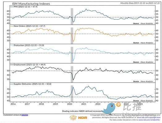 PMI读数低于50表示收缩。所有的GDP增长并没有带来制造业的复兴。我以为特朗普是为了白人蓝领工人?不,兄弟。克林顿把你的工作卖给了中国,特朗普让工厂回来了,但现在工厂地板上全是马斯克拥有的AI机器人手臂。抱歉,你又被耍了!