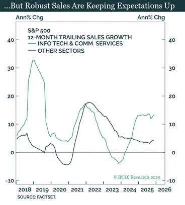 无论是否有泡沫,为了“赢得”AI而增加支出正在驱动美国经济。特朗普承诺让经济运行得火热,他不能仅仅因为几年后这些支出的回报率可能低于资本成本就停下来。