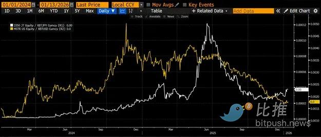 [图表:MSTR和Metaplanet相对于比特币的价格比率]