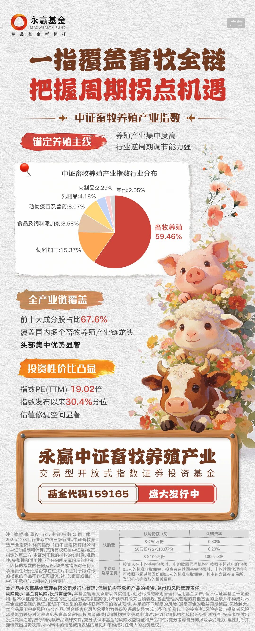 资料来源:永赢基金;历史不代表未来,市场有风险,投资需谨慎永赢中证畜牧养殖产业ETF(代码:159165)为投资者提供了一个低成本、高效率布局畜牧养殖行业的重要工具。当前时点,行业估值处于历史底部,周期反转信号逐步显现,政策红利持续加码,或具备较高的投资性价比。