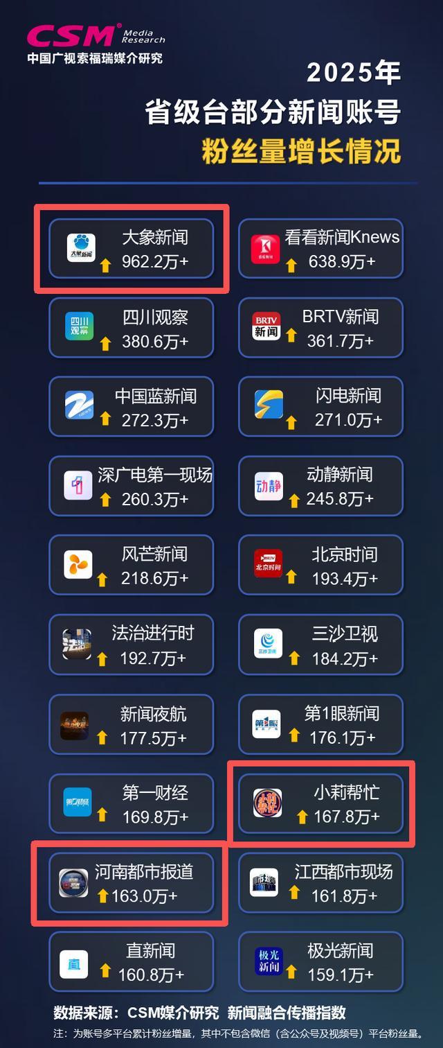 2025年,在抖音、快手腾讯新闻、今日头条、微博、微信(含视频号、公众号)、好看视频、网易新闻等8个平台上,CSM共观察到省级台旗下活跃新闻账号超2500多个,同名合并账号855个。