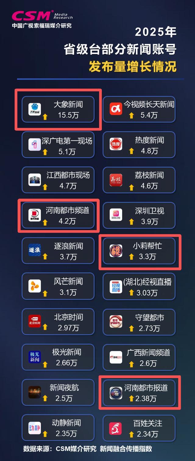 CSM新闻融合传播年度指数发布:2025年,河南台新闻融合传播年度指数在省级台中持续领先;在各项分指数中,网络、短视频、微博、自有客户端等传播指数均保持领先优势,微信传播指数首次进至年度领先位。在中国新闻奖等相关奖项评选中,河南台获奖数量居省级台领先位置。此前,河南台已持续三年领跑多个榜单。