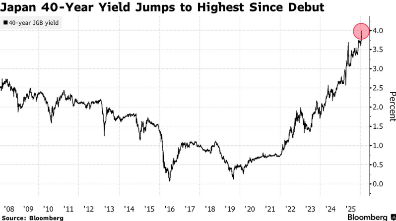 日本40年期国债收益率触及4%,为2007年该券种推出以来的最高水平,也是该国30多年来任何期限主权债收益率首次达到这一水平。