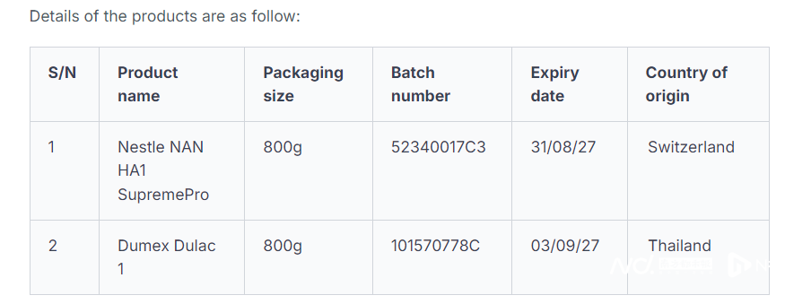 这2批次产品分别为:1批次原产于瑞士的"雀巢NAN HA1 SupremePro",净含量800克,批次号为52340017C3,有效期至2027年8月31日;另外1批次为原产于泰国的"多美滋Dulac 1",净含量800克,批次号101570778C,有效期至2027年9月3日。