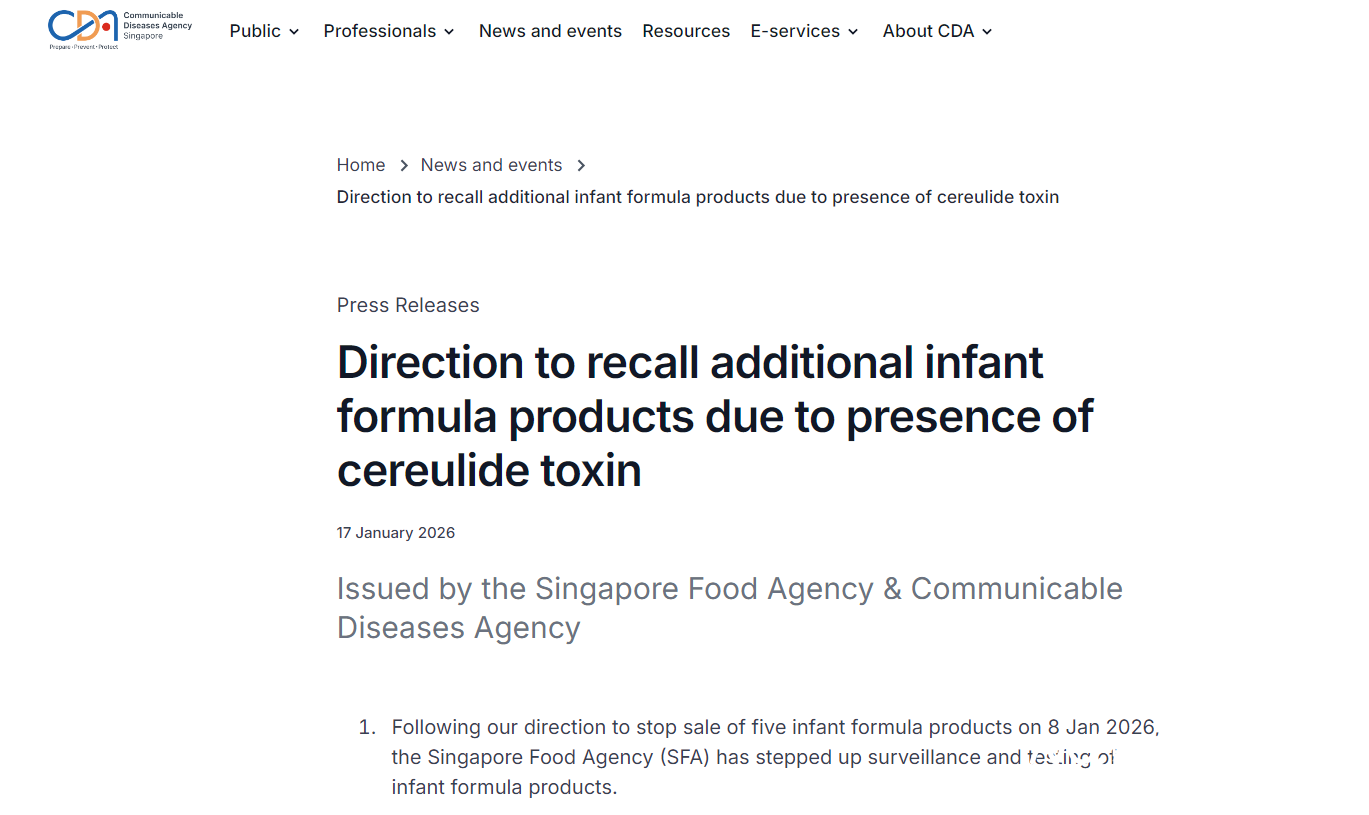新加坡食品局在此次公告中表示,在2款婴儿配方奶粉产品中检测到蜡样芽孢杆菌毒素(cereulide toxin),这些产品可能使用了与此前受影响批次婴儿配方奶粉产品相同的原料,且原料来自同一供应商。