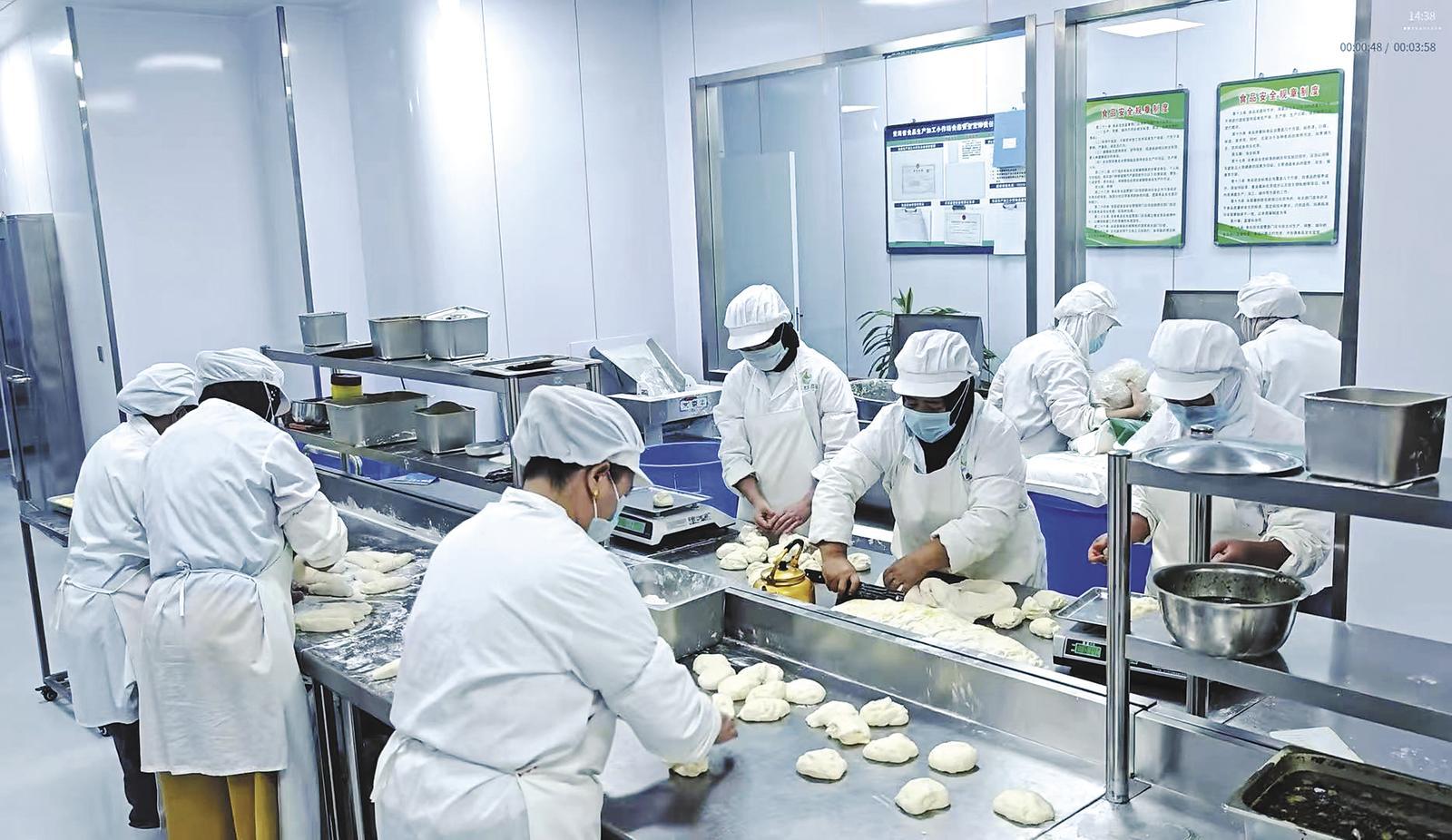 通过“传统工艺+现代营销”的方式联农带农促增收,青海海亚食品有限公司优先吸纳周边留守妇女、脱贫群众及家庭困难劳动力就业,涵盖和面、烤制、打包、直播等多个工种,帮助大家“顾家挣钱两不误”。