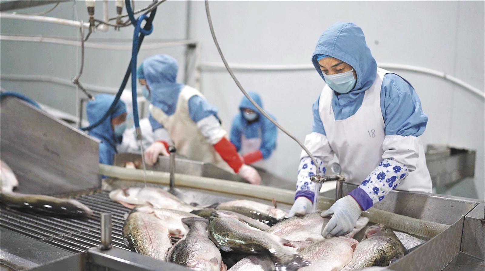 龙洋之鲜的虹鳟鱼初级加工线。本报记者 杨燕玲 摄
