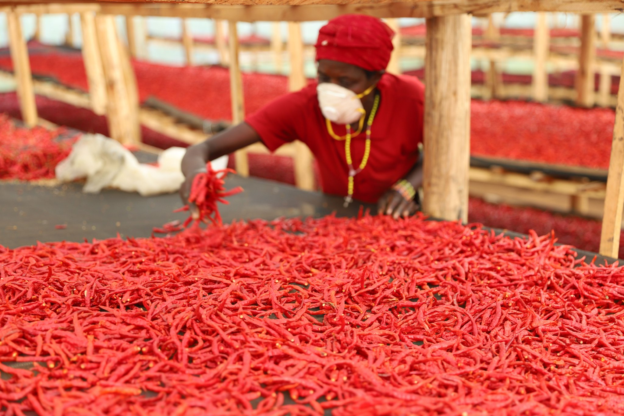 2025年5月22日,工人在卢旺达东方省恩亚加塔雷地区筛选辣椒。2021年8月,首批来自卢旺达的干辣椒运抵湖南,卢旺达成为首个向中国出口干辣椒的非洲国家。新华社记者吉莉摄