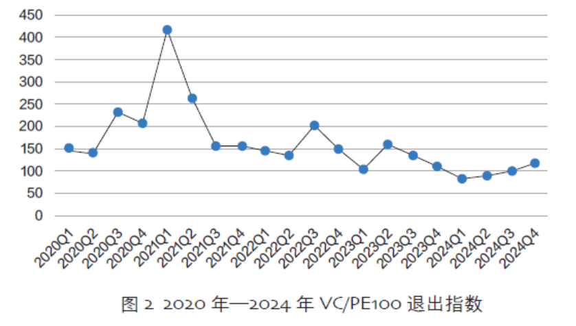 (二)退出渠道有限与避险心态,导致“不愿投”。根据德勤创投披露的情况可知,目前,我国并购基金、私募股权二级市场基金等发展相对滞后,国内VC/PE高度依赖IPO退出,占比达到90%以上。与之相比,美国市场2023年创投基金通过并购、股权转让退出的比例达到92%。随着国内科创板审核趋严叠加二级市场估值回落,IPO退出通道显著收窄。2024年,A股IPO数量仅100家,对应每年1万左右的投资案例数,退出率仅为1%左右。根据清科研究中心发布的“VC/PE100退出指数”可知,2023年市场创近7年以来新低(见图2)。2024年虽然有所回暖,但仍低于历史均值。退出周期延长、资金周转效率下降直接加剧基金管理者的避险心态,使其更倾向于投资成熟企业、成熟行业,影响了对早期硬科技领域的支持力度。