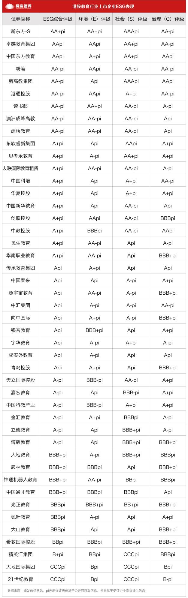 中国财富网讯教育行业作为赋能人才成长、助力社会进步的核心领域,既是知识传承的重要载体,也肩负着可持续发展的社会责任。近日,海南绿色发展信用评级有限公司(以下简称“绿发信评”)发布A股和港股上市公司ESG主动评级结果,全面勾勒了行业ESG发展图景:ESG已成为驱动教育行业高质量发展的关键力量,推动行业向绿色运营、责任育人、规范治理的方向稳步迈进。港股教育企业整体评级集中、多维表现均衡,A股企业则呈现分化态势,头部企业有亮点但部分维度存在短板。