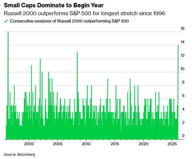 今年以来,美股小盘股在每一个交易日都跑赢了大盘股。周四,以小盘股为主的罗素2000指数收涨0.8%,在2026年内第八次创下收盘新高,且连续第14个交易日跑赢更广泛的标普500指数,创下自1996年5月以来小盘股相对大盘股最长的一段连胜纪录——当时正值互联网泡沫初期。