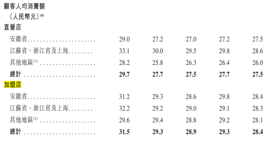 顾客人均消费额也显示,加盟店的人均消费金额从2022年的31.5元持续下降至2025年前8月的28.4元。形成鲜明对比的是直营店,自2023年至2025年前8月基本保持在27.7元~27.5元,较为平稳。